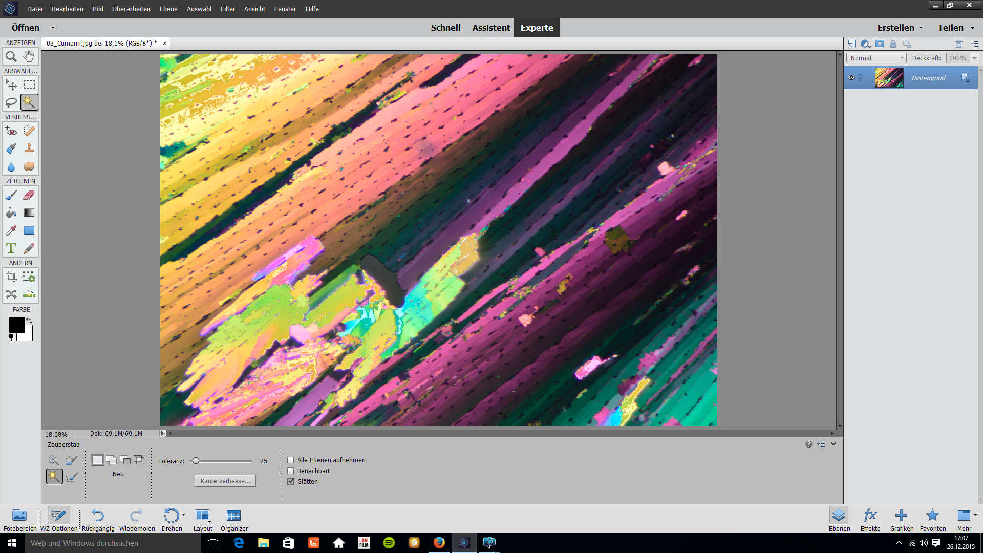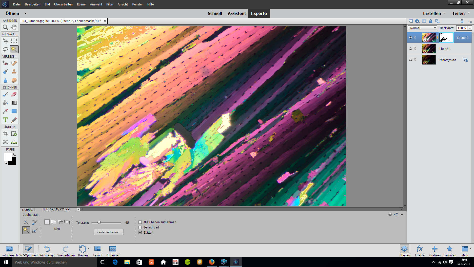 Hier gleich ein praktisches Beispiel, ausgeführt mit Photoshop Elements. Vom Cumarin wurden 3 Aufnahmen unter dem Mikroskop im polarisierten Licht aufgenommen.