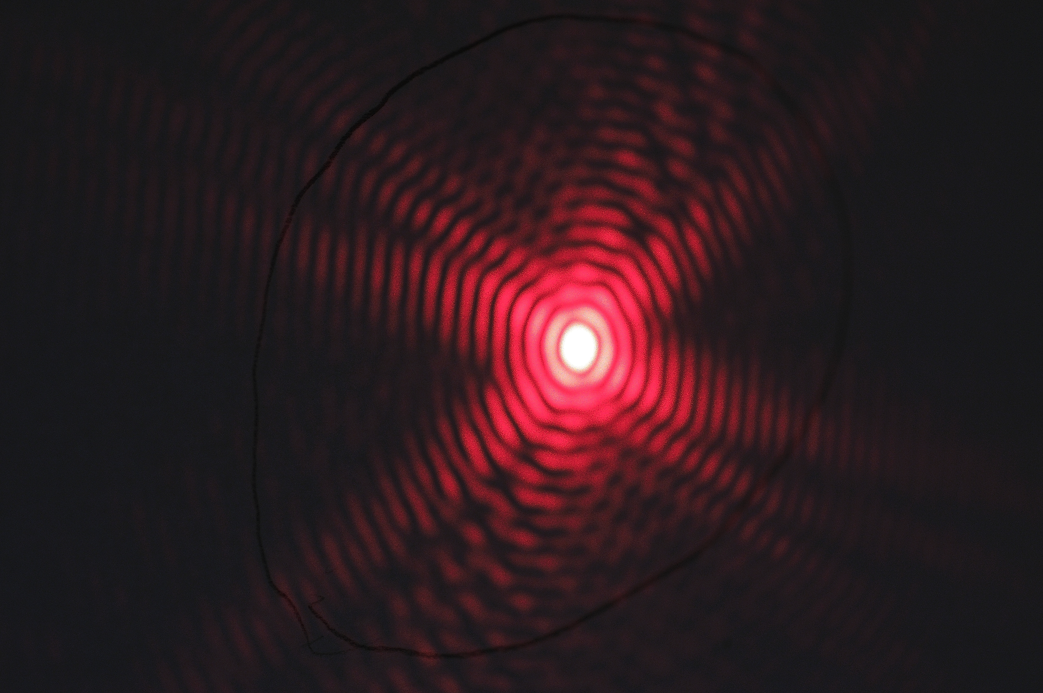 Es gibt aber noch einen anderen Weg, x zu berechnen, der am Ende zu einem ähnlichen Resultat kommt. Er führt über das Rayleigh Kriterium. Wir erinnern uns: Durch den Wellencharakter des Lichts wird ein Lichtpunkt, nicht als Punkt, sondern als Beugungsscheibchen auf einem Bildschirm abgebildet. Zur Demonstration habe ich das Licht eines roten Laser Pointers durch eine enge Blende geleitet und auf einem Bildschirm aufgefangen und fotografiert.