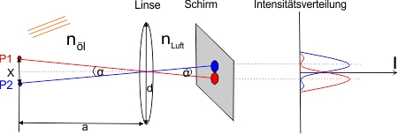 Zwei Punkte P1 und P2 fallen unter einem Winkel ∝ durch eine Linse, mit dem Durchmesser d auf einen Schirm. Das umgebende Medium links von der Linse sei Immersionsöl mit dem Brechungsindex nöl. Rechts von der Linse haben wir den Brechungsindex nLuft und den Winkel ∝’, der sich von ∝ wegen der unterschiedlichen Brechungsindizes unterscheidet. (Ist in der Skizze nicht ganz korrekt gezeichnet). Auf dem Bildschirm, er entspricht dem Zwischenbild im Mikroskop, werden die Punkte gerade noch getrennt als Beugungsscheibchen abgebildet. Die Kurven rechts zeigen die Intensitätsverteilung I des Lichts bei den beiden Beugungsscheibchen. In der Mitte, auf den gestrichelt dargestellten Linien, liegen die Beugungsmaxima 0. Ordnung. Das sind die Lichtanteile, die ungebeugt die Linse passieren. Das Maximum 0. Ordnung der blauen Kurve, fällt zusammen mit dem Minimum 1. Ordnung der roten Kurve. Sie liegen beide auf der blau gestrichelten Linie. Entsprechend fallen das Maximum 0. Ordnung der roten Kurve und das Minimum 1. Ordnung der blauen Kurve auf der rot gestrichelten Linie zusammen.