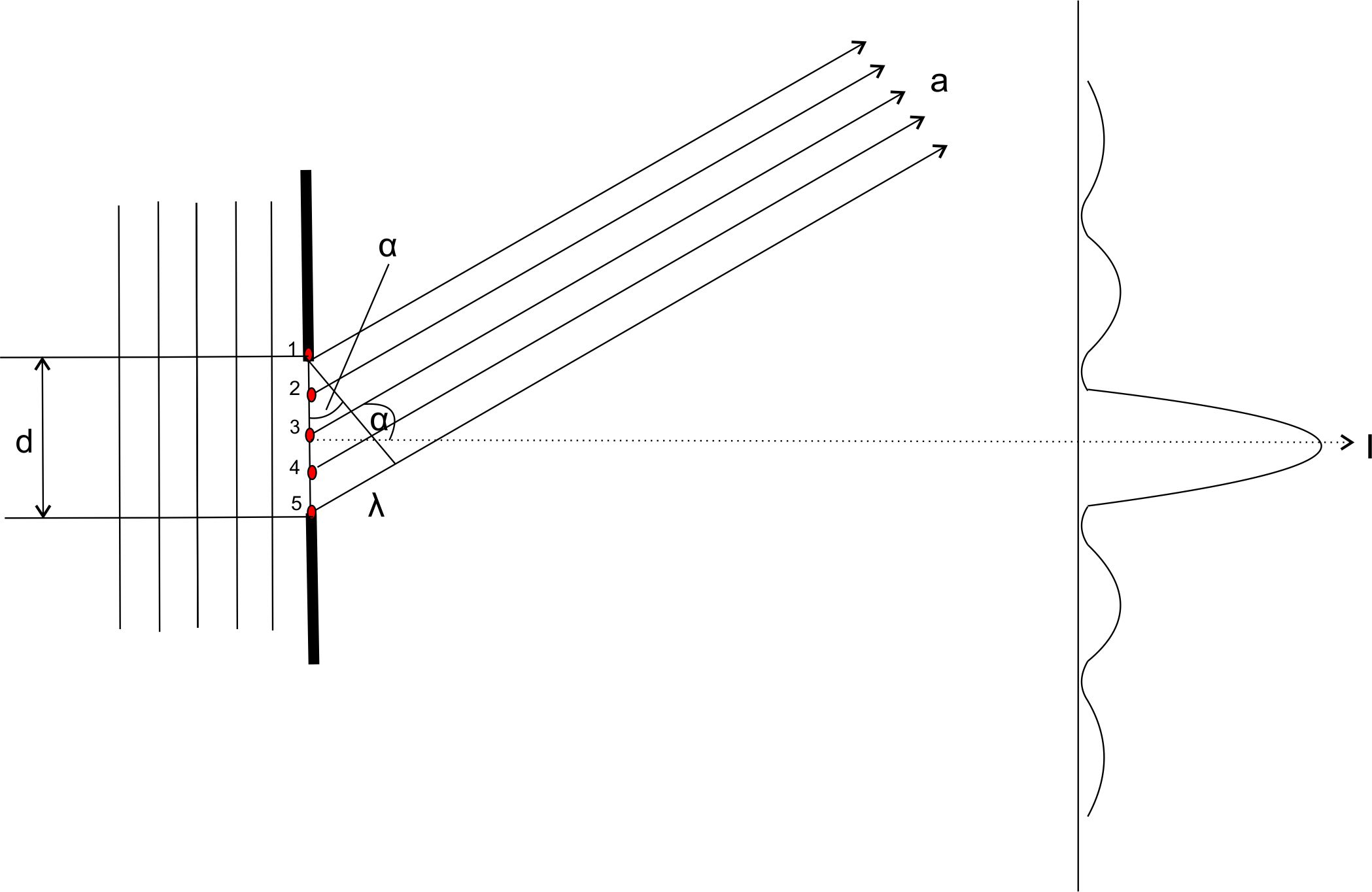 Wir sehen einen Spalt mit der Breite d. Lichtwellen mit der Wellenlänge λ laufen auf den Spalt zu. Auch am Spalt bilden sie, gemäss dem Huygensschen Prinzip neue Elementarwellen, die dann hinter dem Spalt neue Wellenfronten bilden. Diese sind hier aber nicht eingezeichnet. Statt dessen sehen wir einige Wellennormalen oder Wellenstrahlen. Sie geben eine ausgewählte Richtung a des Wellenverlaufs an. Die hier eingezeichneten Wellenstrahlen laufen auf einen fernen Punkt zu, der nicht eingezeichnet ist. Da der Punkt sehr weit entfernt ist, gegenüber der Breite des Spaltes, können wir die Wellenstrahlen parallel zeichnen. Alle von den roten Punkten ausgehende Elementarwellen starten zur gleichen Zeit. Die von Punkt 1 ausgehende Welle hat einen kürzeren Weg zum Ziel, als die von Punkt 5 ausgehende. Der Weg der von Punkt 5 ausgehenden Welle ist genau um die Wellenlänge λ länger. Nun kann man Wellenpaare finden, bei denen der Weg der einen Welle gegenüber der anderen genau λ/2 länger ist. Das sind die Wellenpaare 1,3 2,4 und 3,5. Da diese Wellenpaare am Ziel einen Gangunterschied von λ/2 besitzen, löschen sie sich vollständig aus, da Wellenberg auf Wellental trifft. Also, alle Welle die in Richtung a mit einem Winkel ∝ gegenüber der Horizontale laufen, löschen sich gegenseitig aus. Physiker nennen das destruktive Interferenz.