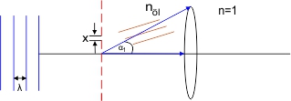 Nach der kleinen Wiederholung begeben wir uns jetzt auf Ernst Abbes Spuren, der übrigens die folgenden Überlegungen vollständig ohne mathematische Formeln zu Papier gebracht hat. Stellen wir uns vor, wir hätten auf einem Objektträger eine sehr feine Struktur von Gitterlinien mit einer Spaltbreite x. (rote gestrichelte Linie). Das Licht unserer Beleuchtung möge die Wellenlänge λ besitzen. Wir wollen sie durch das Mikroskop mit Immersionsöl vom Brechungsindex nöl betrachten. Nehmen wir weiter an, wir könnten den Öffnungswinkel des Objektivs unseres Mikroskops verändern. (Solche Mikroskope gibt es).