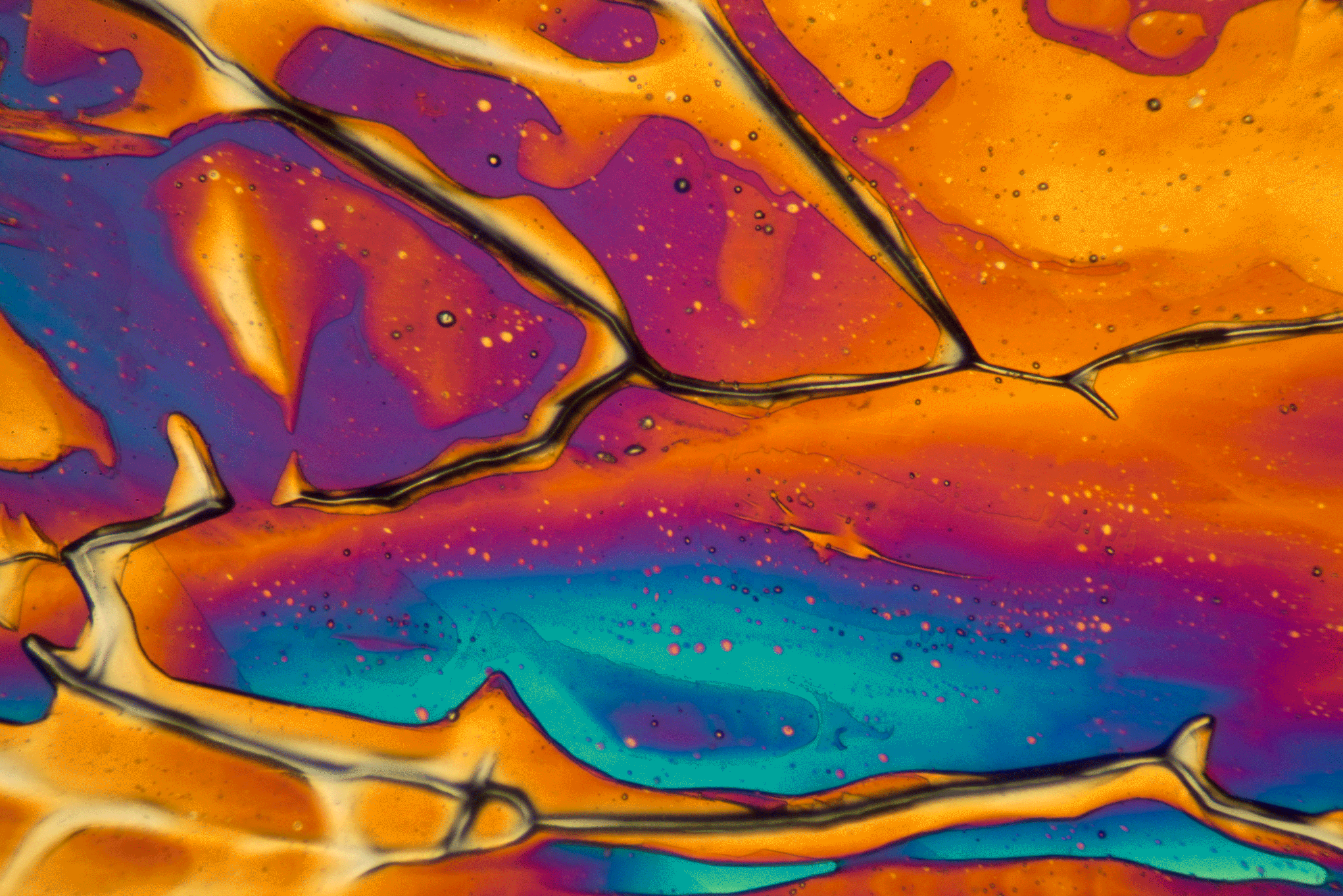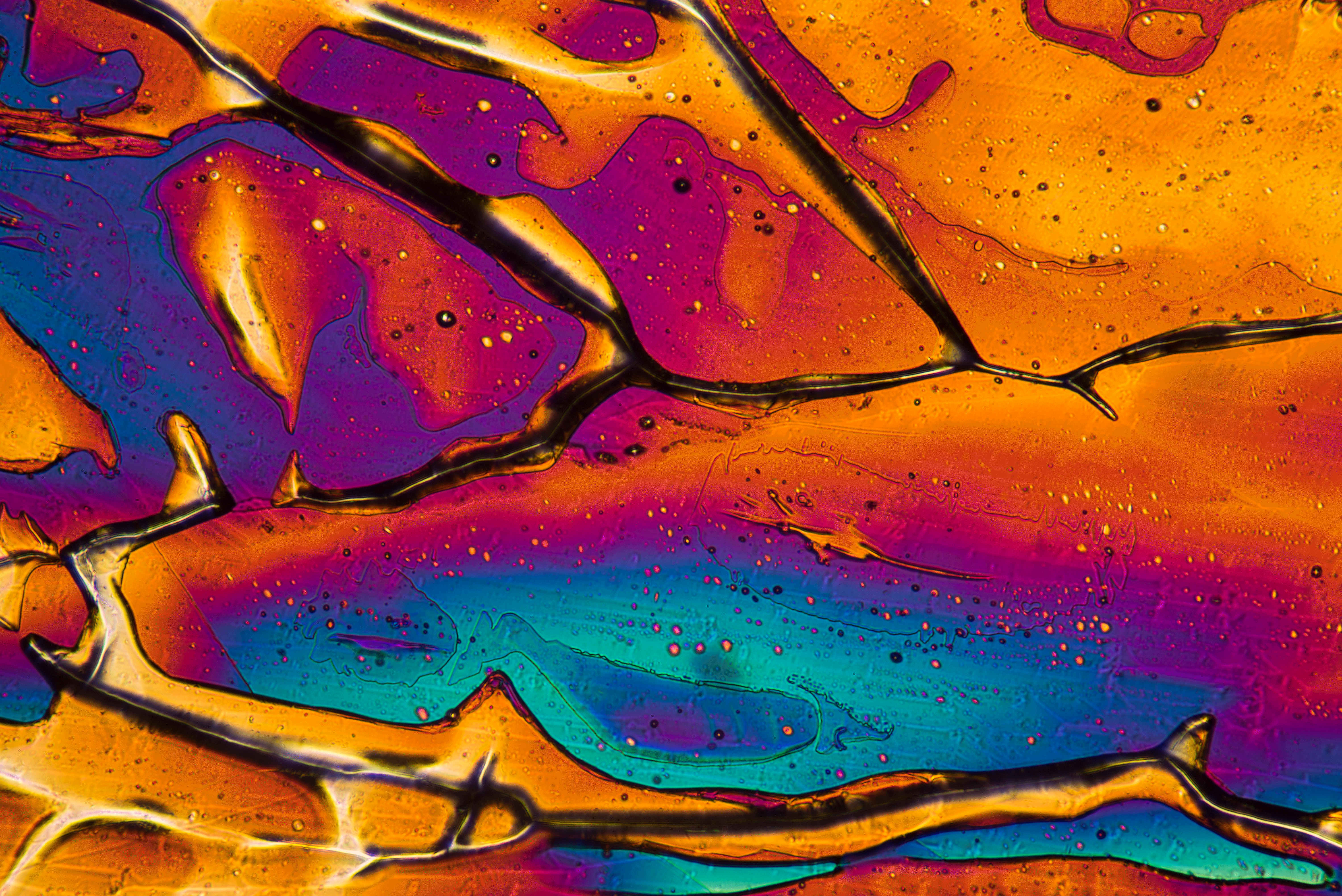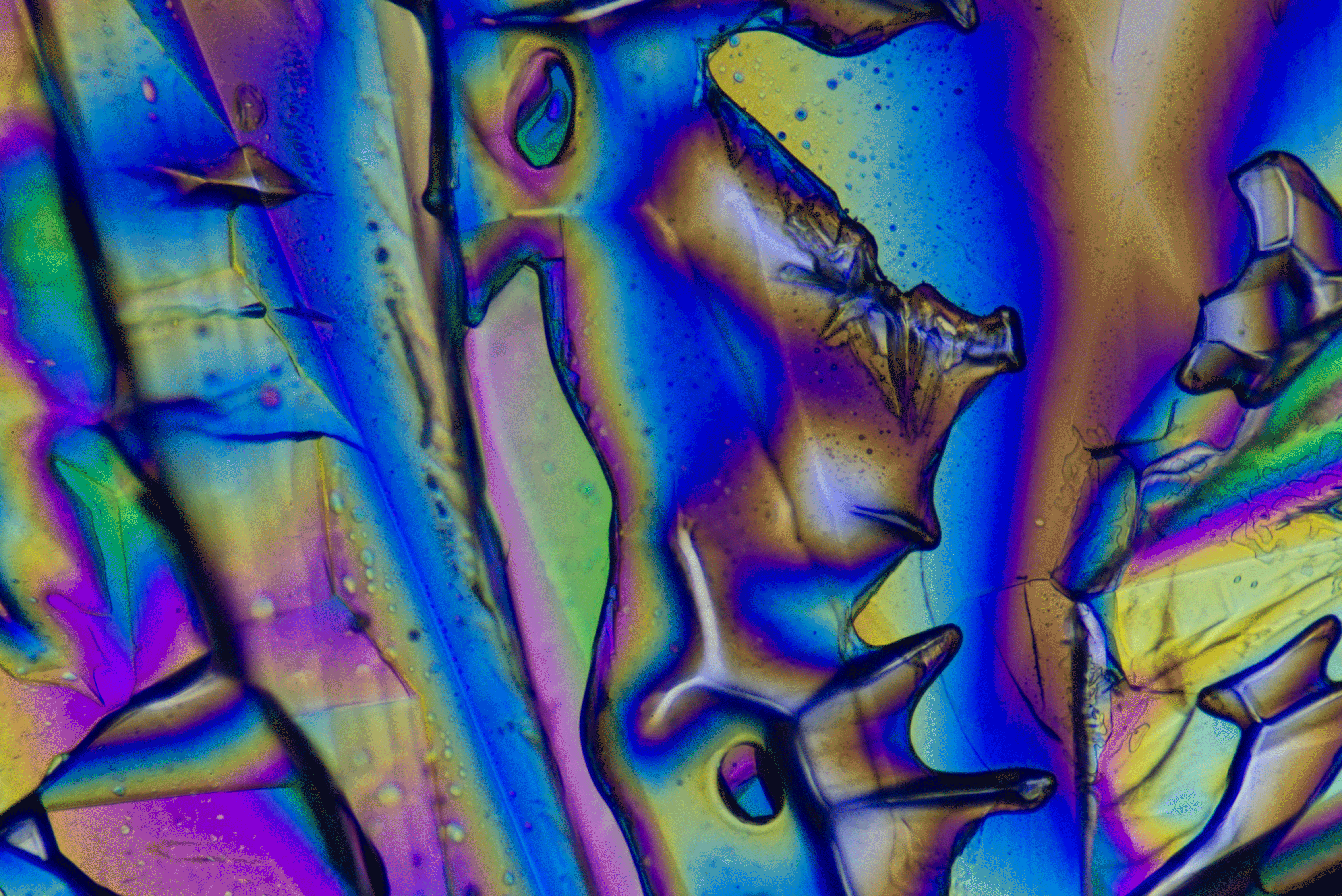 Fangen wir mit der Lichtquelle an: Ich betrachte hier schwerpunktmäßig das Fotografieren von Mikrokristallen im polarisierten Licht. Wer noch ein älteres Mikroskop mit einem Schwenkspiegel besitzt, mit dem er das Tageslicht durch die Kristalle leitet, muß nicht verzagen. Keine andere Lichtquelle ist für unsere Zwecke besser geeignet, als Tageslicht. Um die prächtigen farbigen Bilder im polarisierten Licht erzeugen zu können, benötigen wir eine Lichtquelle mit einem möglichst breiten Wellenspektrum. Da ist das Tageslicht ideal. Auch herkömmliche Glühlampen besitzen ein relativ breites Wellenspektrum. Für LED’s hingegen trifft das nicht in dem Maße zu. Sie sind daher für unsere Zwecke wenig geeignet. Also aufpassen, welche Lichtquelle man benutzt. Hier gleich ein Beispiel: Das gleiche Motiv wurde einmal mit der Mikroskopbeleuchtung meines Mikroskops, einer 12V, 30W Halogenlampe und danach mit einer LED-Lampe aus einem Baumarkt beleuchtet. Beide Aufnahmen wurden nicht nachbearbeitet. Die Mikrokristalle waren Magnesiumsulfat.