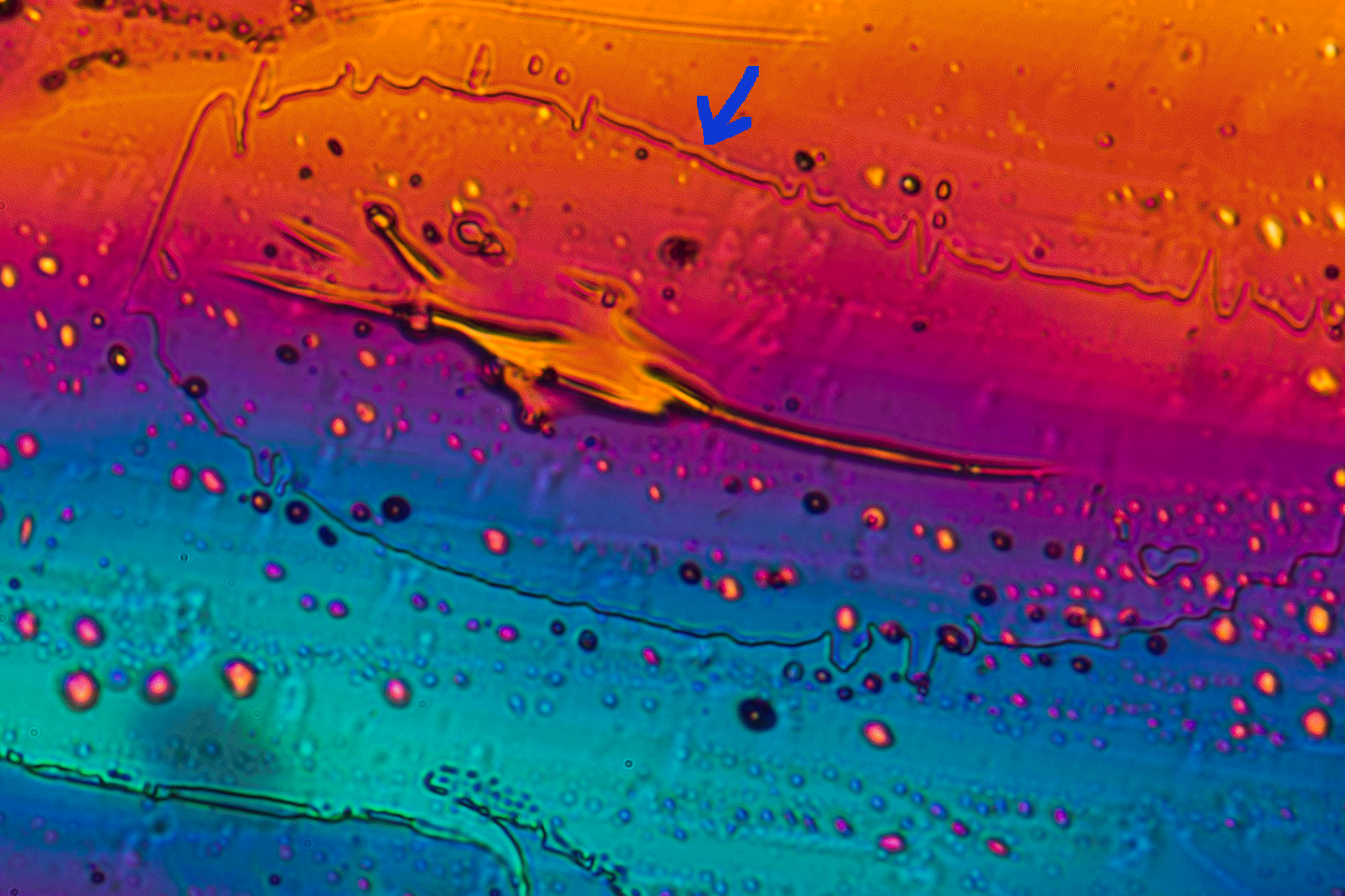 Betrachtet man z.B. die Linie, auf die der blaue Pfeil zeigt, so sieht man helle Säume entlang der Linie, die nicht zum Bild gehören. Wir haben es hier mit Beugungserscheinungen zu tun, die sich mit der Wellennatur des Lichts erklären lassen.